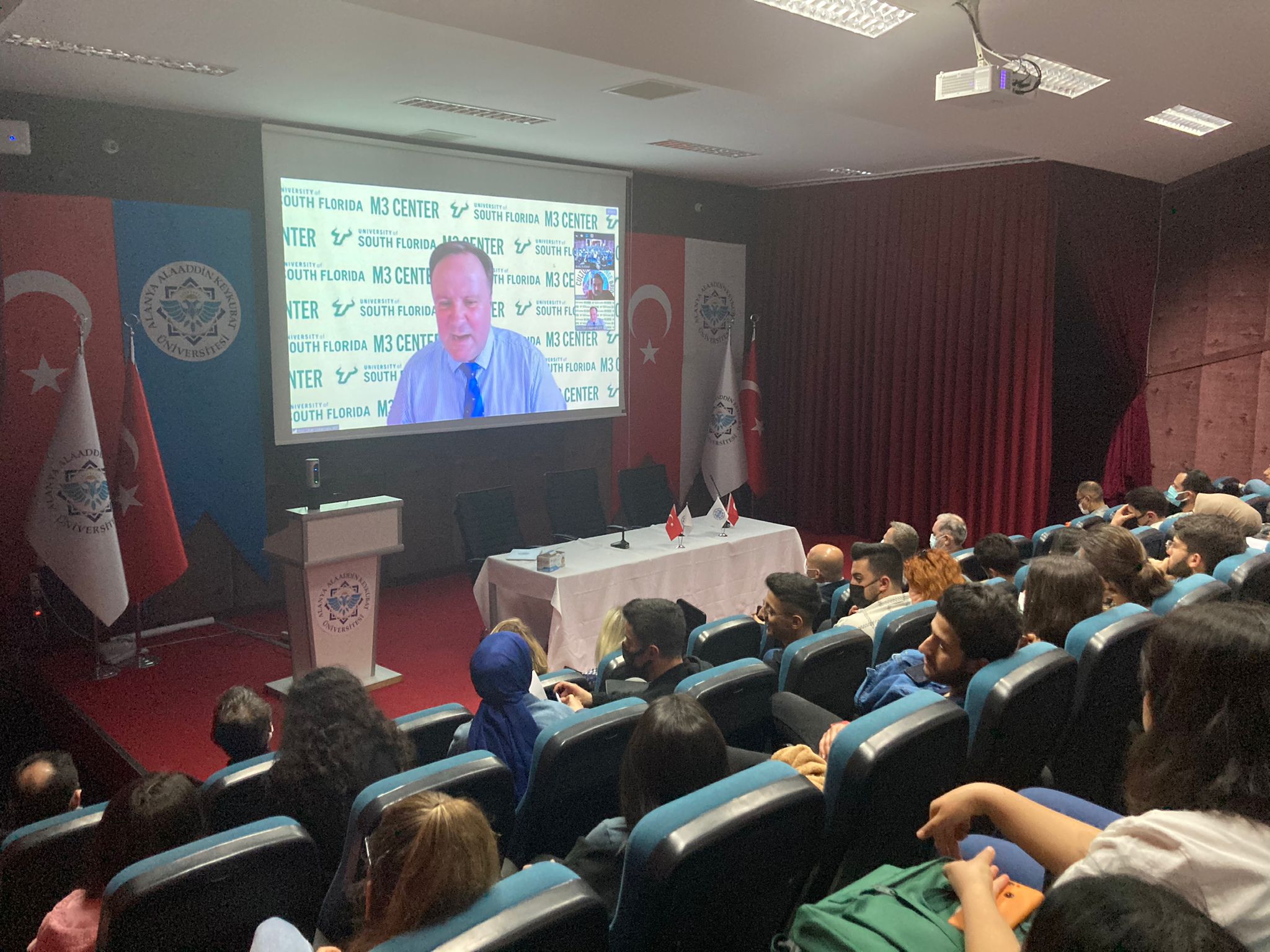 Dersin ilk bölümünde Prof. Dr. Cihan ÇOBANOĞLU kendi kariyerini anlatarak yurt dışındaki akademik kariyer imkanlarından bahsetti. Dersin ikinci bölümünde Cihan KEYİF yurtdışında work & travel ile ilgili bir sunum yaparak öğrencilerin yapması gereken prosedürleri anlattı. Ayrıca, Güney Florida Üniversitesi ile Cultural Exchange Bridge arasında yakın bir gelecekte imzalanacak olan work & travel sırasında ilgili alandaki dersleri içeren üniversite sertifika eğitiminin birlikte sunulacağı ifade edildi. Açılış dersinin sonunda TURAM Müdürü Prof. Dr. Burçin Cevdet ÇETİNSÖZ, Prof. Dr. Cihan ÇOBANOĞLU ve Cihan KEYİF’e katılım gösterdikleri için teşekkürlerini iletti.